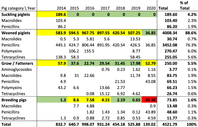 Table 1 Total added antimicrobial treatment index values applicable in Belgium (BD100) per year, presented for the years 2014–2020, per pig category treated and per antimicrobial category. Colours: green: acceptable level of use, yellow: attention level, red: action level (AMCRA, Belgium)